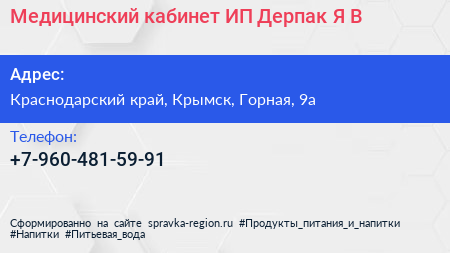 Медицинский кабинет, ИП Дерпак Я.В. по адресу Краснодарский край, Крымск, Горная, 9а в дальнейшем Организация, размещена в следующих категориях: