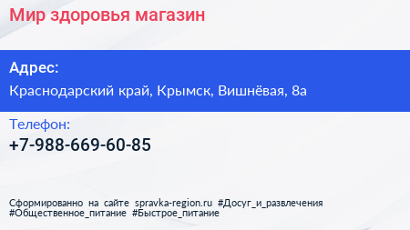 Мир здоровья, магазин по адресу Краснодарский край, Крымск, Вишнёвая, 8а в дальнейшем Организация, размещена в следующих категориях: