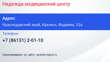 Надежда, медицинский центр по адресу Краснодарский край, Крымск, Фадеева, 52а в дальнейшем Организация, размещена в следующих категориях: