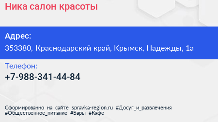 Ника, салон красоты по адресу 353380, Краснодарский край, Крымск, Надежды, 1а в дальнейшем Организация, размещена в следующих категориях: