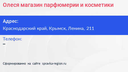 Олеся, магазин парфюмерии и косметики по адресу Краснодарский край, Крымск, Ленина, 211 в дальнейшем Организация, размещена в следующих категориях: