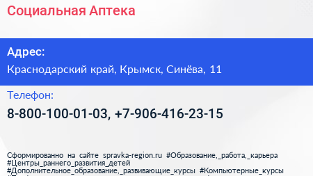 Социальная Аптека по адресу Краснодарский край, Крымск, Синёва, 11 в дальнейшем Организация, размещена в следующих категориях: