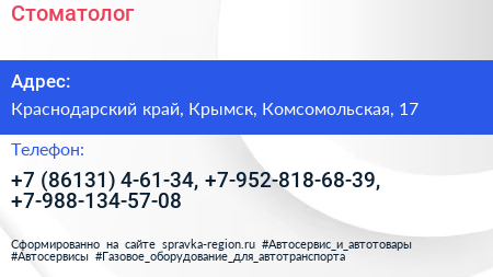Стоматолог по адресу Краснодарский край, Крымск, Комсомольская, 17 в дальнейшем Организация, размещена в следующих категориях: