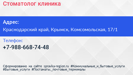 Стоматолог, клиника по адресу Краснодарский край, Крымск, Комсомольская, 17/1 в дальнейшем Организация, размещена в следующих категориях: