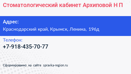 Стоматологический кабинет Архиповой Н.П. по адресу Краснодарский край, Крымск, Ленина, 196д в дальнейшем Организация, размещена в следующих категориях: