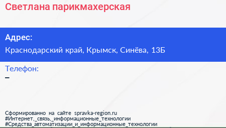 Светлана, парикмахерская по адресу Краснодарский край, Крымск, Синёва, 13Б в дальнейшем Организация, размещена в следующих категориях: