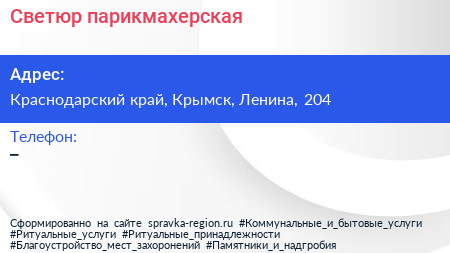 Светюр, парикмахерская по адресу Краснодарский край, Крымск, Ленина, 204 в дальнейшем Организация, размещена в следующих категориях: