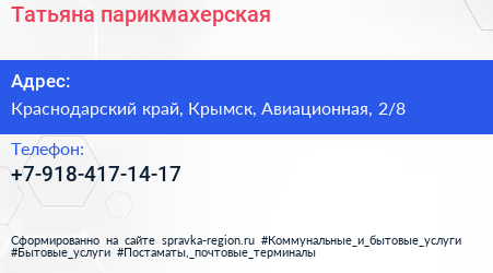 Татьяна, парикмахерская по адресу Краснодарский край, Крымск, Авиационная, 2/8 в дальнейшем Организация, размещена в следующих категориях:
