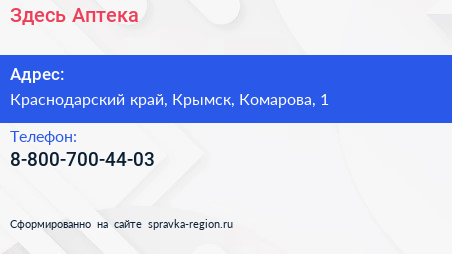 Здесь Аптека по адресу Краснодарский край, Крымск, Комарова, 1 в дальнейшем Организация, размещена в следующих категориях: