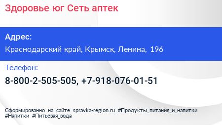 Здоровье-юг, Сеть аптек по адресу Краснодарский край, Крымск, Ленина, 196 в дальнейшем Организация, размещена в следующих категориях:
