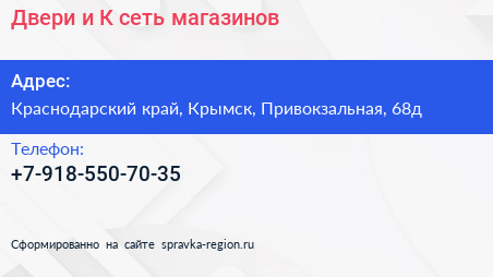 Двери и К, сеть магазинов по адресу Краснодарский край, Крымск, Привокзальная, 68д в дальнейшем Организация, размещена в следующих категориях: