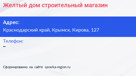 Желтый дом, строительный магазин по адресу Краснодарский край, Крымск, Кирова, 127 в дальнейшем Организация, размещена в следующих категориях: