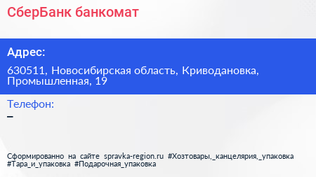 СберБанк, банкомат по адресу 630511, Новосибирская область, Криводановка, Промышленная, 19 в дальнейшем Организация, размещена в следующих категориях: