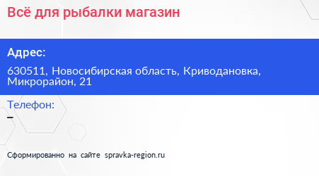 Всё для рыбалки, магазин по адресу 630511, Новосибирская область, Криводановка, Микрорайон, 21 в дальнейшем Организация, размещена в следующих категориях: