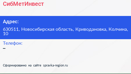 СибМетИнвест по адресу 630511, Новосибирская область, Криводановка, Колчина, 10 в дальнейшем Организация, размещена в следующих категориях:
