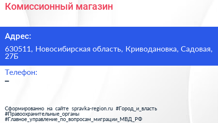 Комиссионный магазин по адресу 630511, Новосибирская область, Криводановка, Садовая, 27Б в дальнейшем Организация, размещена в следующих категориях: