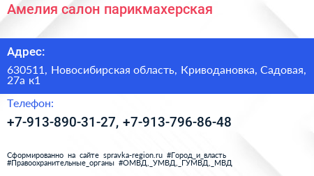 Амелия, салон-парикмахерская по адресу 630511, Новосибирская область, Криводановка, Садовая, 27а к1 в дальнейшем Организация, размещена в следующих категориях: