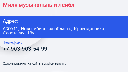 Миля, музыкальный лейбл по адресу 630511, Новосибирская область, Криводановка, Советская, 19а в дальнейшем Организация, размещена в следующих категориях: