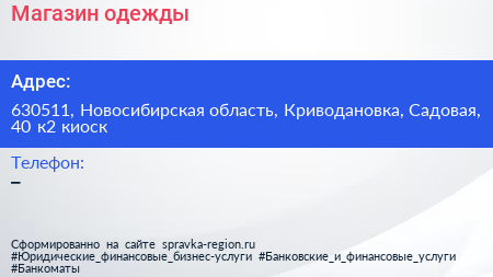 Магазин одежды по адресу 630511, Новосибирская область, Криводановка, Садовая, 40 к2 киоск в дальнейшем Организация, размещена в следующих категориях: