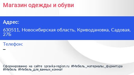 Магазин одежды и обуви по адресу 630511, Новосибирская область, Криводановка, Садовая, 27Б в дальнейшем Организация, размещена в следующих категориях: