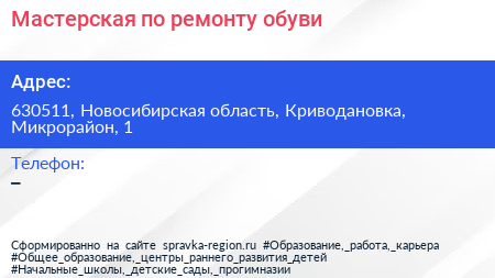 Мастерская по ремонту обуви по адресу 630511, Новосибирская область, Криводановка, Микрорайон, 1 в дальнейшем Организация, размещена в следующих категориях: