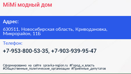 MiMi, модный дом по адресу 630511, Новосибирская область, Криводановка, Микрорайон, 11Б в дальнейшем Организация, размещена в следующих категориях: