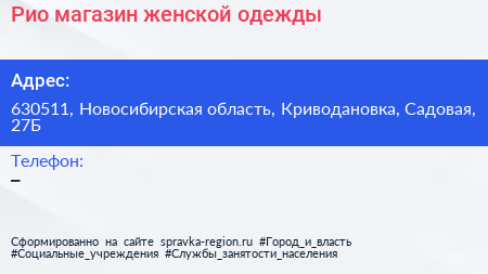 Рио, магазин женской одежды по адресу 630511, Новосибирская область, Криводановка, Садовая, 27Б в дальнейшем Организация, размещена в следующих категориях: