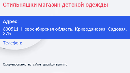 Стильняшки, магазин детской одежды по адресу 630511, Новосибирская область, Криводановка, Садовая, 27Б в дальнейшем Организация, размещена в следующих категориях: