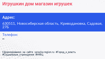 Игрушкин дом, магазин игрушек по адресу 630511, Новосибирская область, Криводановка, Садовая, 27Б в дальнейшем Организация, размещена в следующих категориях: