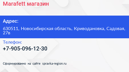 Marafett, магазин по адресу 630511, Новосибирская область, Криводановка, Садовая, 27в в дальнейшем Организация, размещена в следующих категориях:
