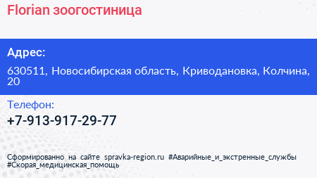 Florian, зоогостиница по адресу 630511, Новосибирская область, Криводановка, Колчина, 20 в дальнейшем Организация, размещена в следующих категориях: