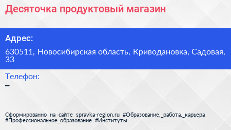 Десяточка, продуктовый магазин по адресу 630511, Новосибирская область, Криводановка, Садовая, 33 в дальнейшем Организация, размещена в следующих категориях: