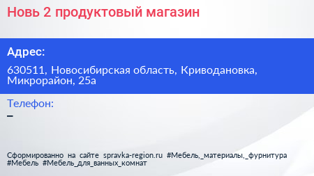 Новь-2, продуктовый магазин по адресу 630511, Новосибирская область, Криводановка, Микрорайон, 25а в дальнейшем Организация, размещена в следующих категориях: