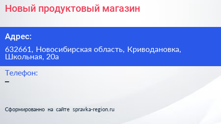Новый, продуктовый магазин по адресу 632661, Новосибирская область, Криводановка, Школьная, 20а в дальнейшем Организация, размещена в следующих категориях: