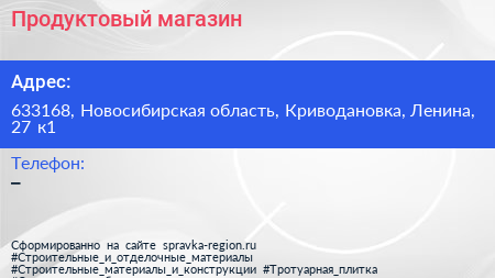 Продуктовый магазин по адресу 633168, Новосибирская область, Криводановка, Ленина, 27 к1 в дальнейшем Организация, размещена в следующих категориях: