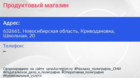 Продуктовый магазин по адресу 632661, Новосибирская область, Криводановка, Школьная, 20 в дальнейшем Организация, размещена в следующих категориях: