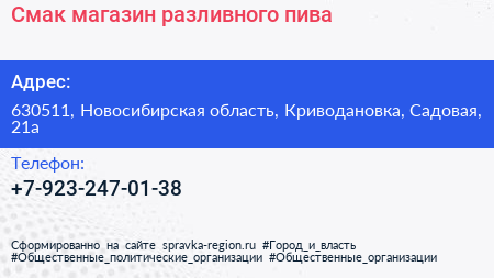 Смак, магазин разливного пива по адресу 630511, Новосибирская область, Криводановка, Садовая, 21а в дальнейшем Организация, размещена в следующих категориях: