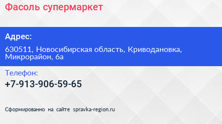 Фасоль, супермаркет по адресу 630511, Новосибирская область, Криводановка, Микрорайон, 6а в дальнейшем Организация, размещена в следующих категориях:
