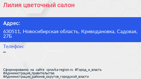 Лилия, цветочный салон по адресу 630511, Новосибирская область, Криводановка, Садовая, 27Б в дальнейшем Организация, размещена в следующих категориях:
