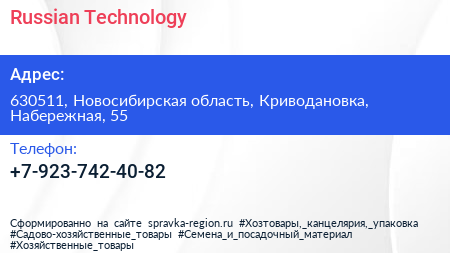 Russian Technology по адресу 630511, Новосибирская область, Криводановка, Набережная, 55 в дальнейшем Организация, размещена в следующих категориях: