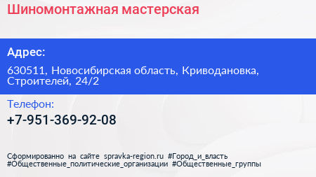 Шиномонтажная мастерская по адресу 630511, Новосибирская область, Криводановка, Строителей, 24/2 в дальнейшем Организация, размещена в следующих категориях: