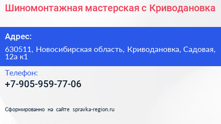 Шиномонтажная мастерская, с. Криводановка по адресу 630511, Новосибирская область, Криводановка, Садовая, 12а к1 в дальнейшем Организация, размещена в следующих категориях: