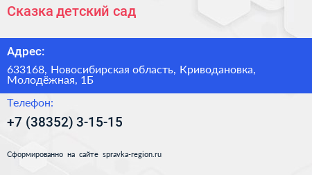 Сказка, детский сад по адресу 633168, Новосибирская область, Криводановка, Молодёжная, 1Б в дальнейшем Организация, размещена в следующих категориях: