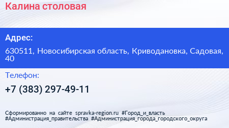 Калина, столовая по адресу 630511, Новосибирская область, Криводановка, Садовая, 40 в дальнейшем Организация, размещена в следующих категориях: