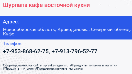 Шурпапа, кафе восточной кухни по адресу Новосибирская область, Криводановка, Северный объезд, Кафе в дальнейшем Организация, размещена в следующих категориях: