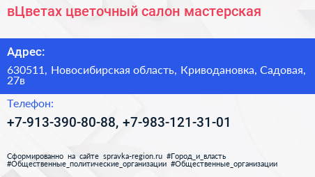 вЦветах, цветочный салон-мастерская по адресу 630511, Новосибирская область, Криводановка, Садовая, 27в в дальнейшем Организация, размещена в следующих категориях: