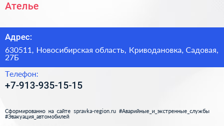 Ателье по адресу 630511, Новосибирская область, Криводановка, Садовая, 27Б в дальнейшем Организация, размещена в следующих категориях:
