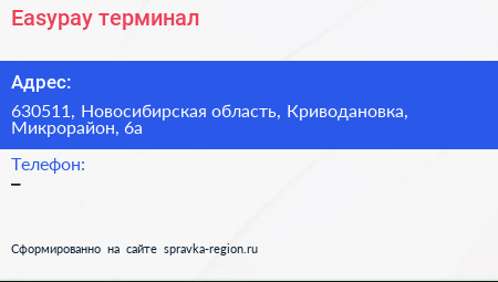 Easypay, терминал по адресу 630511, Новосибирская область, Криводановка, Микрорайон, 6а в дальнейшем Организация, размещена в следующих категориях: