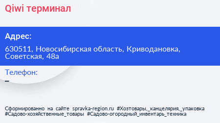 Qiwi, терминал по адресу 630511, Новосибирская область, Криводановка, Советская, 48а в дальнейшем Организация, размещена в следующих категориях: