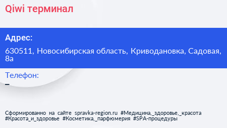 Qiwi, терминал по адресу 630511, Новосибирская область, Криводановка, Садовая, 8а в дальнейшем Организация, размещена в следующих категориях: